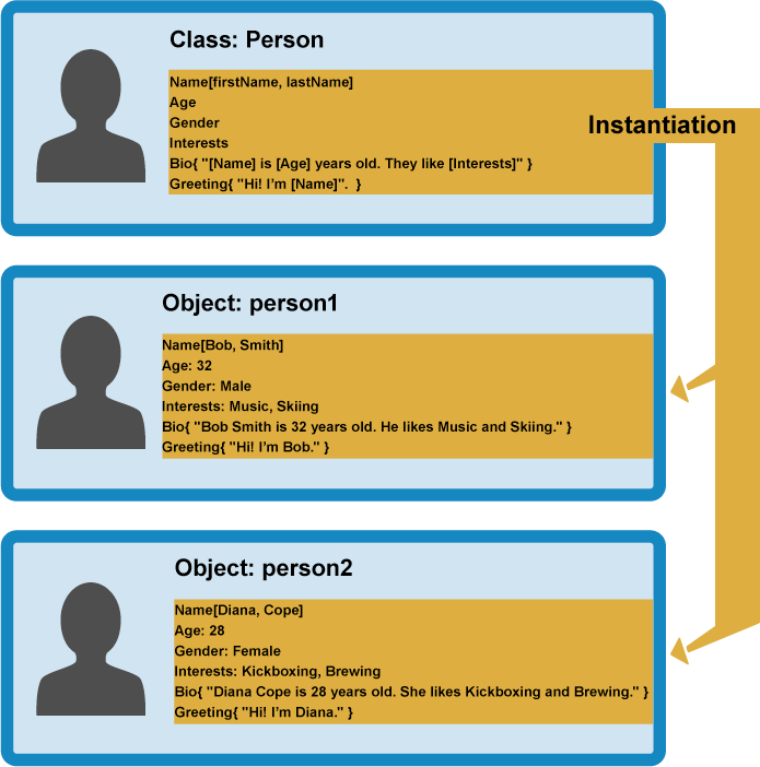 Após a criação dos novos objetos, as variáveis person1 e person2 contêm os seguintes objetos: